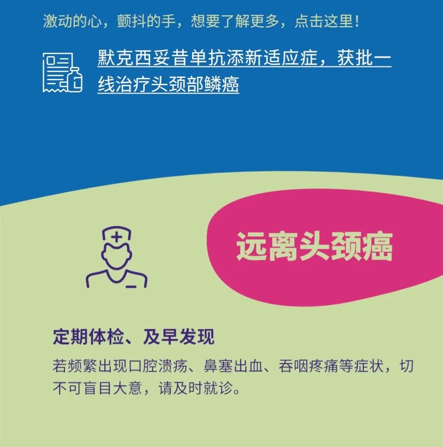 与此同时,不要忽视口腔溃疡、鼻塞出血、吞咽困难等常见症状,长期出现不适应尽早到医院排查是否患有头颈部肿瘤,不要拖到中晚期才想到找医生。