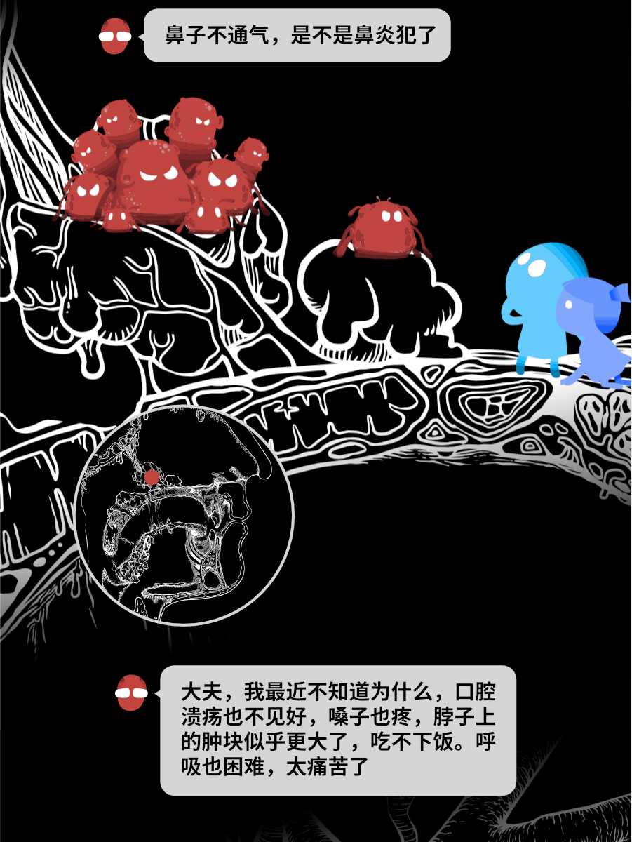 由于发病部位特殊,持续生长的肿瘤会压迫口腔咽喉部位,造成疼痛并影响张口、吞咽、进食、呼吸、嗅觉、味觉和容貌,严重影响患者的生活质量。